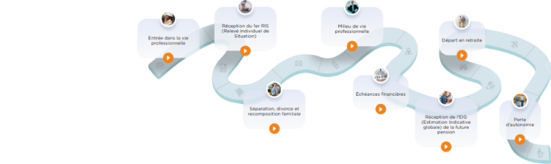 Vous y trouverez une frise chronologique interactive qui met en lumière les étapes clés de votre parcours personnel et professionnel ayant un impact sur votre retraite. Pour chaque moment, nous vous proposons des explications claires, des conseils pratiques et des outils pour mieux vous accompagner.